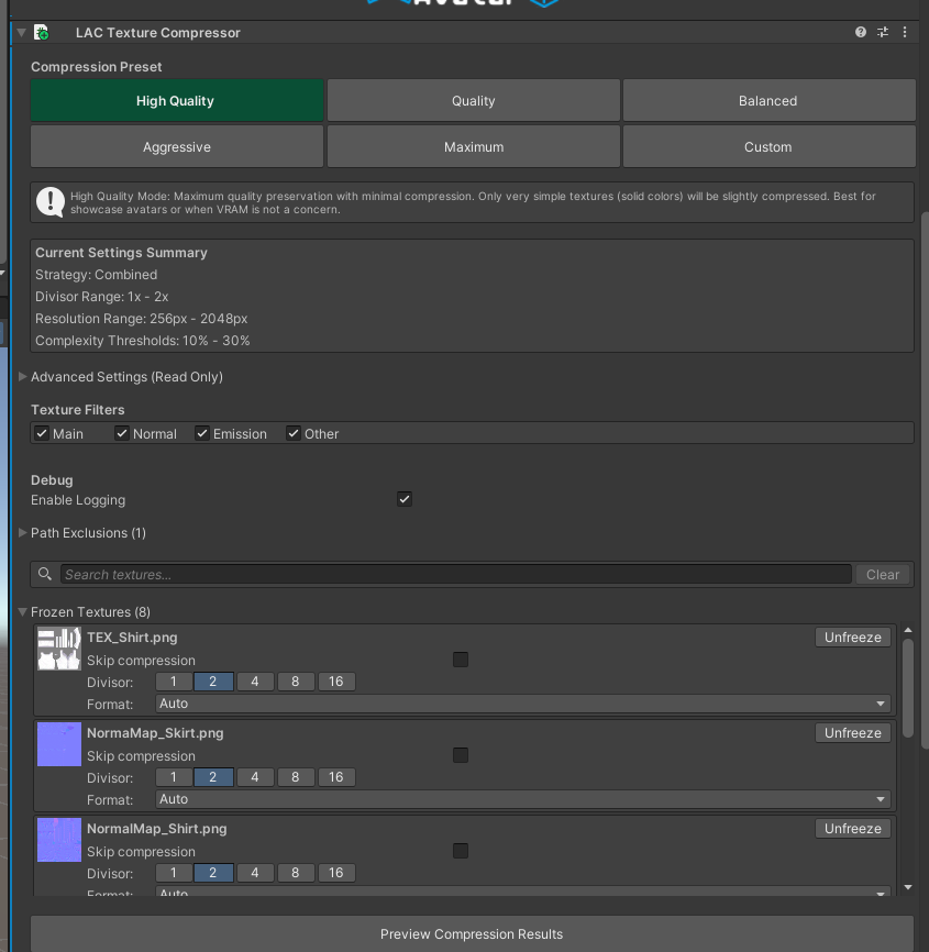 本插件可对avatar的所有纹理选择性压缩,从而在控制质量的情况下大幅优化模型下载大小,显存占用以及解压大小,插件界面如下图: